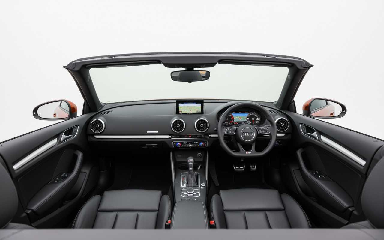 O seu design é uma obra de equilíbrio perfeito entre elegância e agressividade. Mantém as linhas limpas e sofisticadas do Audi A3, mas tempera-as com os detalhes inconfundíveis da família S: para-choques desportivos, a grelha Singleframe específica, as quatro saídas de escape e as capas dos espelhos retrovisores em alumínio. A capota de lona integra-se com mestria na silhueta, criando um perfil tão atraente com a capota aberta como com ela fechada. É um carro que vira cabeças pela sua desportividade contida e pela sua classe inegável.