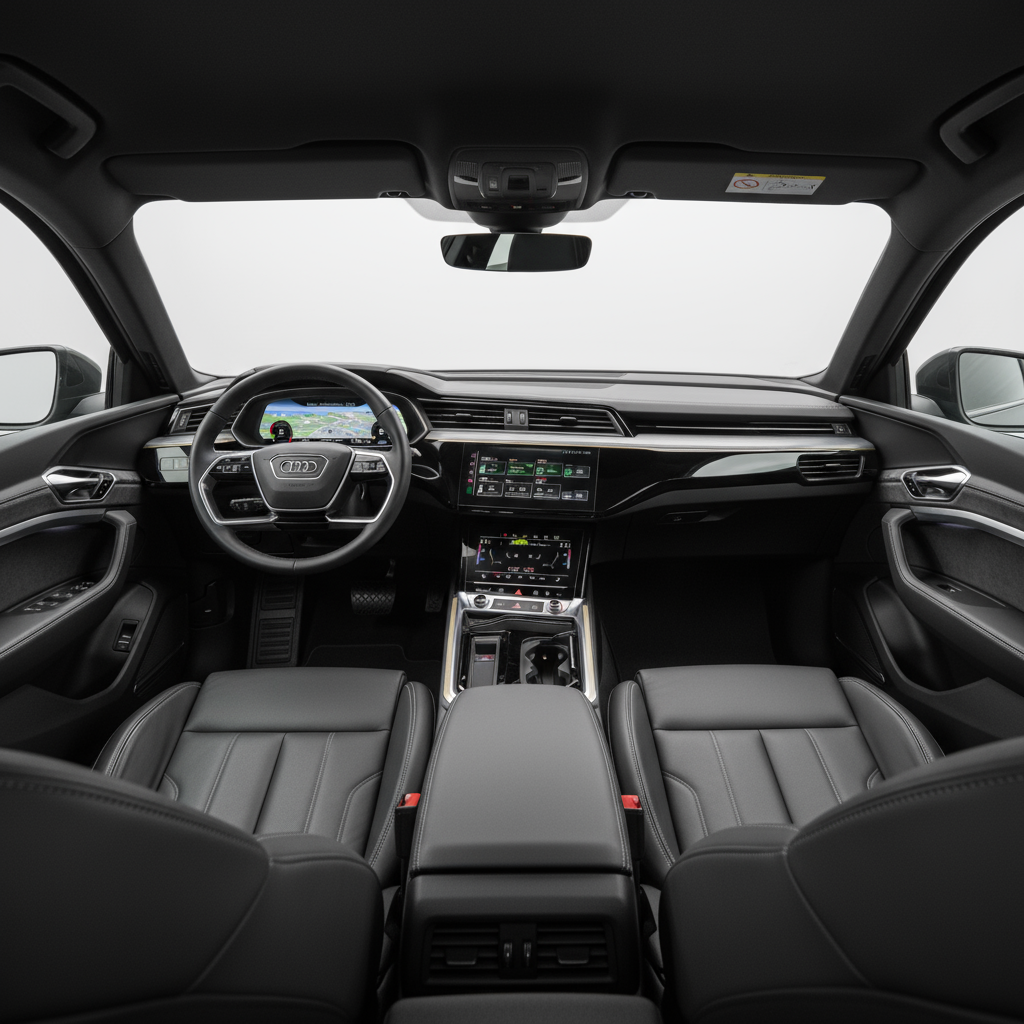 O design do e-tron é uma obra-prima de equilíbrio. É inconfundivelmente um Audi, com uma presença imponente e linhas musculosas acentuadas pelo pacote S line. No entanto, detalhes como a grelha Singleframe quase fechada e a ausência de tubos de escape sussurram a sua natureza elétrica. Por dentro, o habitáculo é um santuário tecnológico. Recebe-te um ambiente de luxo minimalista, dominado pelos ecrãs do Virtual Cockpit e pelo sistema MMI, onde cada material e cada ajuste gritam qualidade. É um espaço amplo e luminoso, projetado não apenas para transportar, mas para deleitar os sentidos.