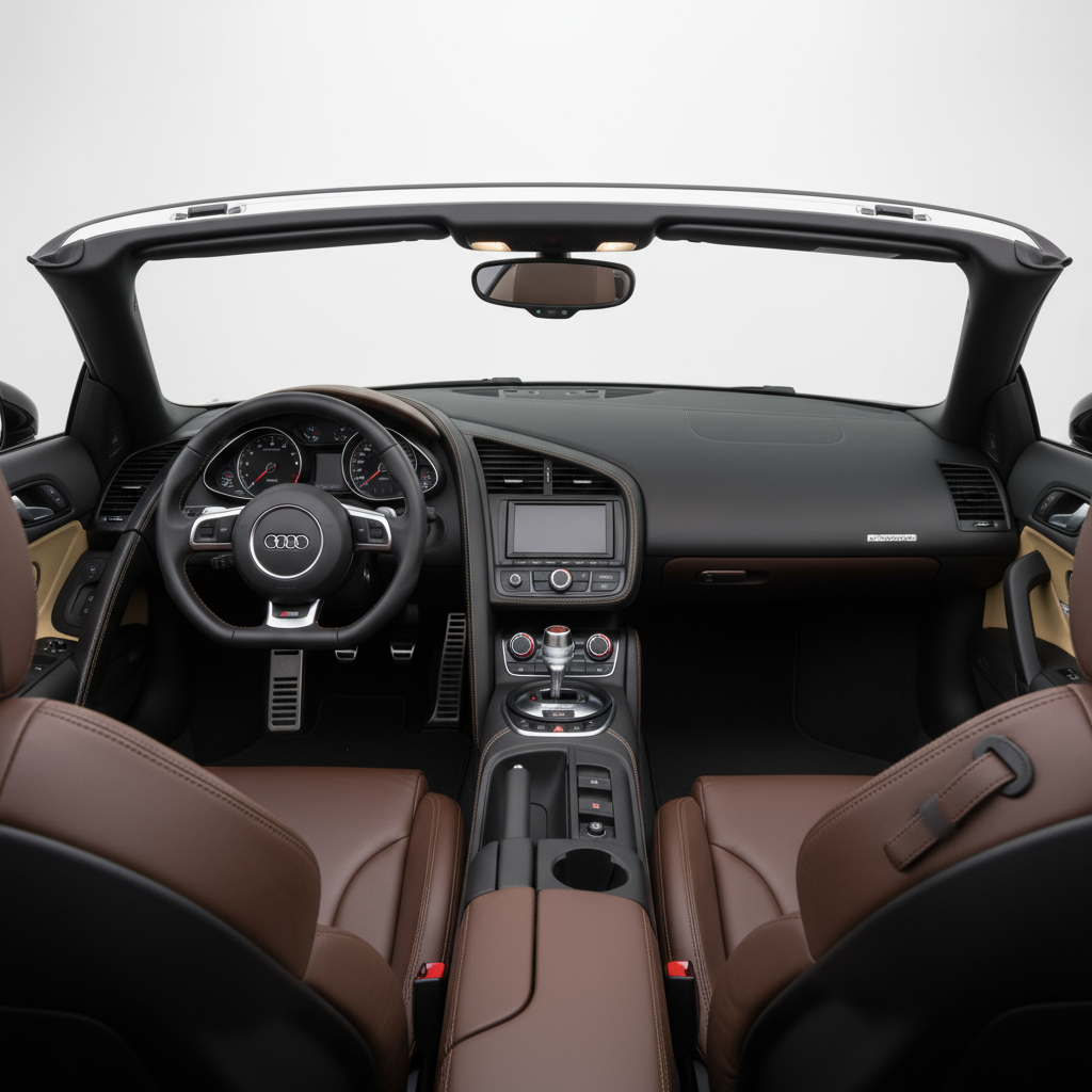 Sob a sua carroçaria escultural, o R8 Spyder é uma vitrine tecnológica da sua época. O chassis Audi Space Frame em alumínio confere-lhe leveza e uma rigidez torcional excecional, fundamental num descapotável. O motor 4.2 FSI de injeção direta é uma joia da engenharia, capaz de atingir quase 8000 rpm. A tração integral permanente quattro, com uma distribuição de binário que favorece o eixo traseiro, assegura uma dinâmica soberba, enquanto a transmissão R tronic oferecia passagens de caixa rápidas e uma ligação mecânica ao motor.