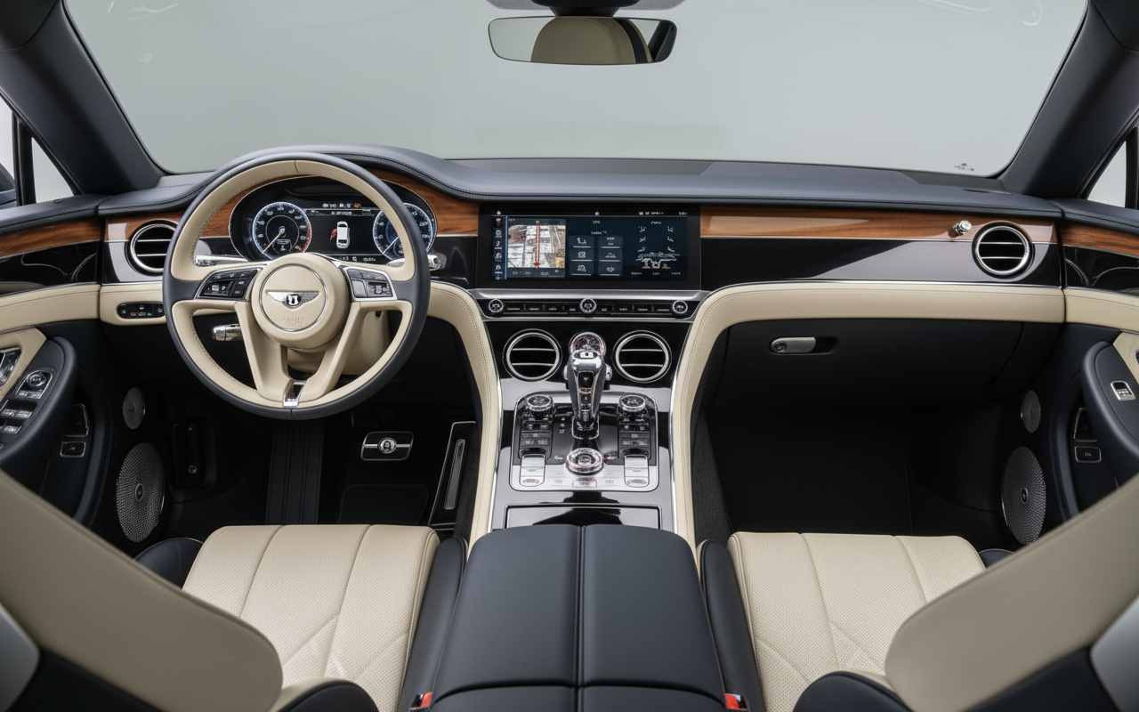 Sob essa aparência clássica esconde-se um arsenal tecnológico de vanguarda. A peça central é o espetacular ecrã rotativo da Bentley, uma joia da engenharia que permite escolher entre um ecrã tátil de 12.3 polegadas, três relógios analógicos de sublime beleza ou uma superfície de madeira imaculada. O painel de instrumentos é completamente digital e configurável, oferecendo toda a informação necessária com uma clareza cristalina. A tecnologia aqui não procura sobrecarregar, mas sim servir e deleitar, integrando-se de forma orgânica na experiência de luxo supremo.