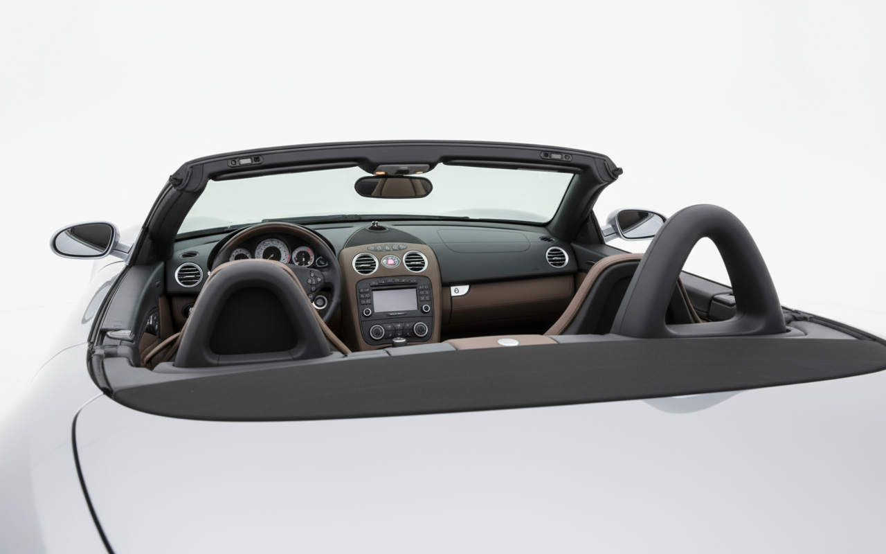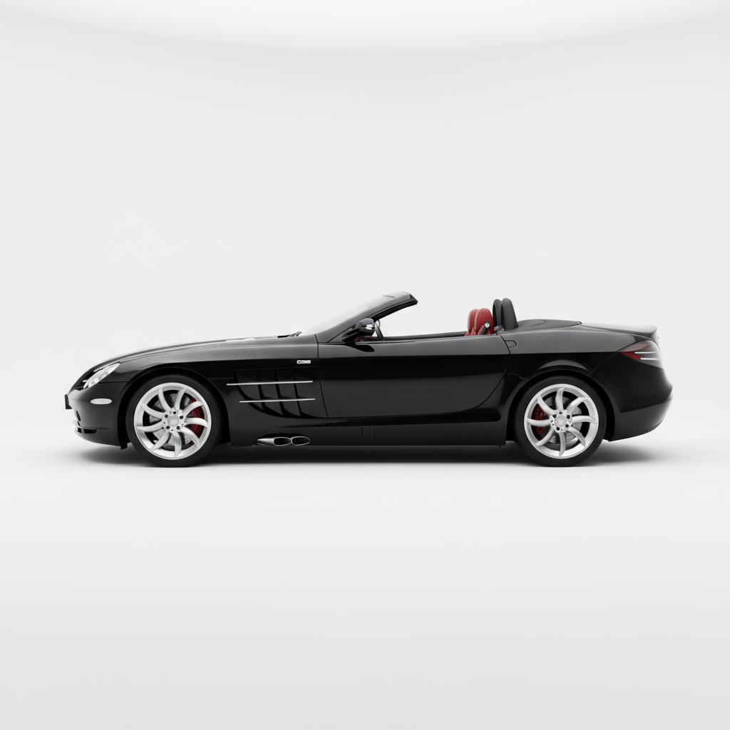 O design do Mercedes-Benz SLR Roadster é uma declaração de intenções. Suas linhas fluidas e agressivas, inspiradas nos carros de Fórmula 1, conferem-lhe uma presença inconfundível. O longo capô, as guelras laterais e as portas tipo 'asa de gaivota' são elementos que o distinguem e o elevam à categoria de ícone. A capota de lona, que se dobra elegantemente, não diminui em nada seu apelo, mas o transforma, oferecendo uma silhueta ainda mais espetacular. Cada detalhe, dos faróis às saídas de escape laterais, foi cuidadosamente projetado para transmitir potência, elegância e exclusividade. É uma escultura em movimento, uma obra de arte que atrai todos os olhares.