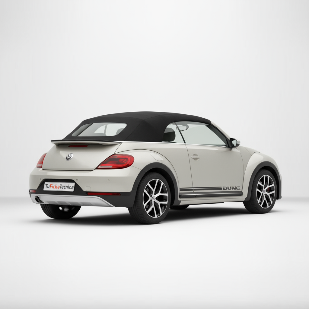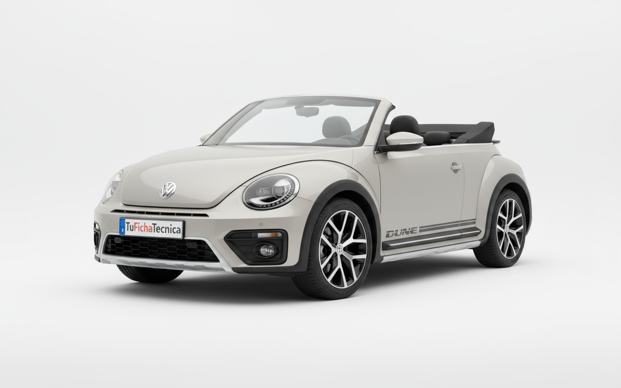 Apesar da sua estética retro, o Beetle Cabrio Dune de 2016 incorpora tecnologia moderna para melhorar a experiência de condução e a segurança. O motor 2.0 TSI com injeção direta, turbo e intercooler, juntamente com o sistema Stop&Start, otimiza o consumo e as emissões. A transmissão DSG de dupla embraiagem é uma referência em suavidade e eficiência. Quanto à segurança, conta com travões de disco ventilados dianteiros e discos traseiros, assim como uma suspensão bem equilibrada (McPherson à frente e paralelogramo deformável atrás) que garante um bom comportamento dinâmico. Embora não se especifiquem os sistemas de assistência à condução mais avançados de hoje em dia, a Volkswagen sempre priorizou a segurança ativa e passiva nos seus modelos.