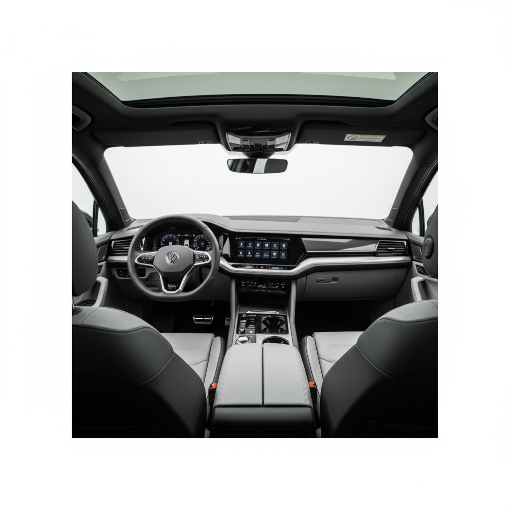 O design do Touareg R-Line é imponente e elegante, com linhas que transmitem robustez e sofisticação. Os seus 4902 mm de comprimento e 1984 mm de largura conferem-lhe uma presença dominante na estrada. Os detalhes R-Line acentuam o seu caráter desportivo, com jantes de 20 polegadas e pneus 285/45 R20 que não só melhoram a estética, mas também contribuem para a sua excelente aderência. O interior, com capacidade para cinco ocupantes, destaca-se pela sua amplitude e pela qualidade dos seus acabamentos, oferecendo uma bagageira generosa de 810 litros que o torna um companheiro ideal para viagens longas ou para o dia a dia familiar.